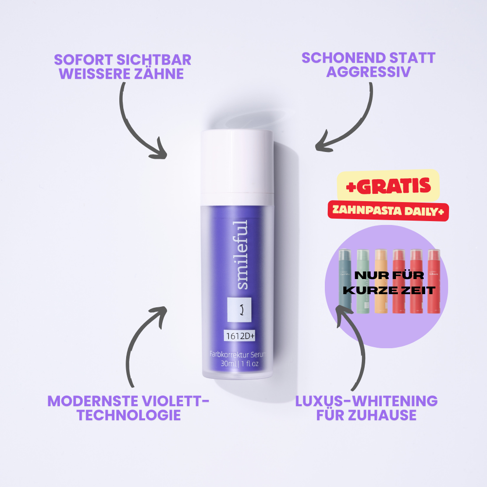 Inspiriert vom Prinzip des Silbershampoos: Ein violetter Farbton neutralisiert gelbliche Untertöne und gleicht Pigmente aus. Perfekt, um dein Lächeln in Sekunden sichtbar aufzufrischen – ohne Bleaching.